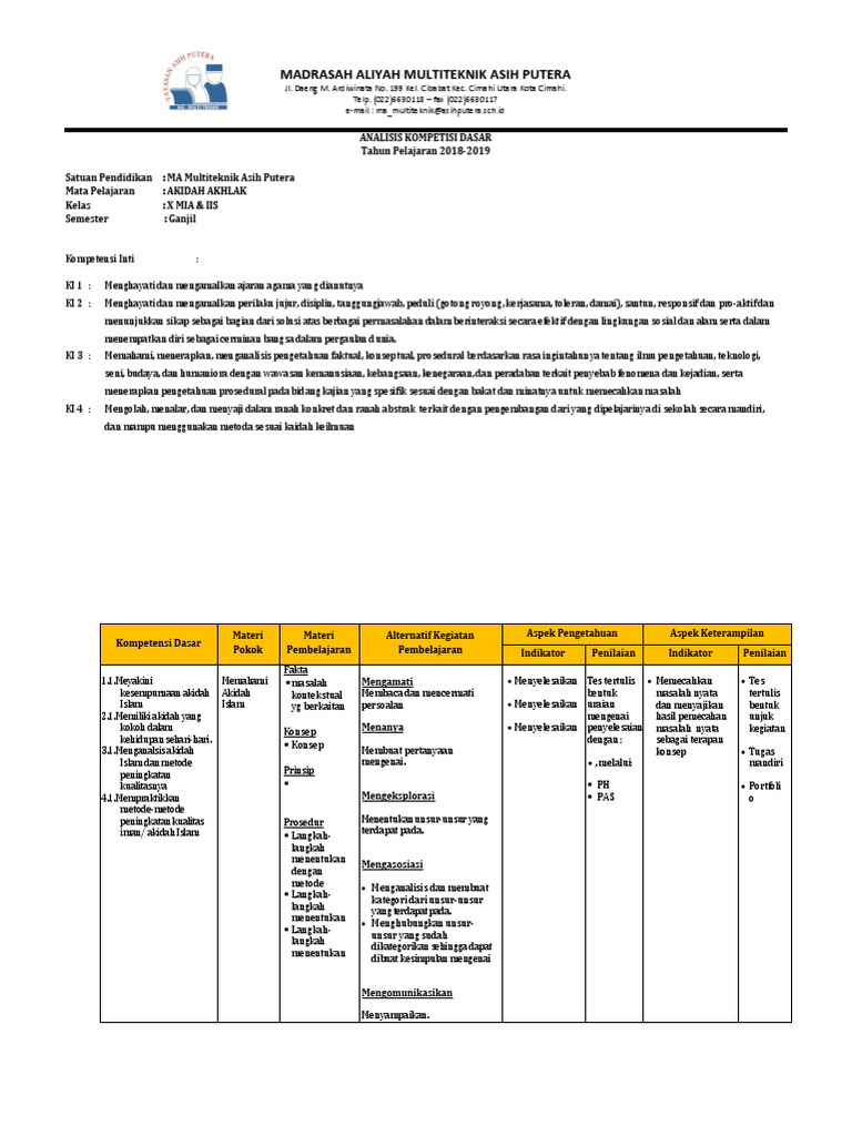 Dalam silabus akidah akhlak mi kurikulum 2013 semester 1 dan 2 ini merupakan perangkat terbaru. Kompetensi inti (ki) dan kompetensi dasar (kd) akidah akhlak hadits pada madrasah ibtidaiyah (mi) diatur dalam kma nomor 183 tahun 2019 tentang kurikulum pai dan bahasa arab. Menunjukkan perilaku jujur, disiplin, tanggung jawab, santun, peduli, dan percaya diri dalam berinteraksi dengan keluarga, teman, guru, dan tetangganya serta cinta anah air. Sep 10, 2019 · pada kesempatan ini, file guru now akan berbagi kepada bapak/ibu guru yang mengajar di sekolah menengah atas ( sma ) mengenai pemetaan ki kd akidah akhlak kls x, xi, xii madrasah aliyah ma kurikulum 2013 revisi 2018 semester 1 dan 2 tahun pelajaran 2019/2020 yang didukung atau didampingi oleh administrasi lain dalam penyusunannya diantaranya terdiri dari: 1.3 menghayati akhlak yang baik dalam hidup bertetangga dan bermasyarakat.