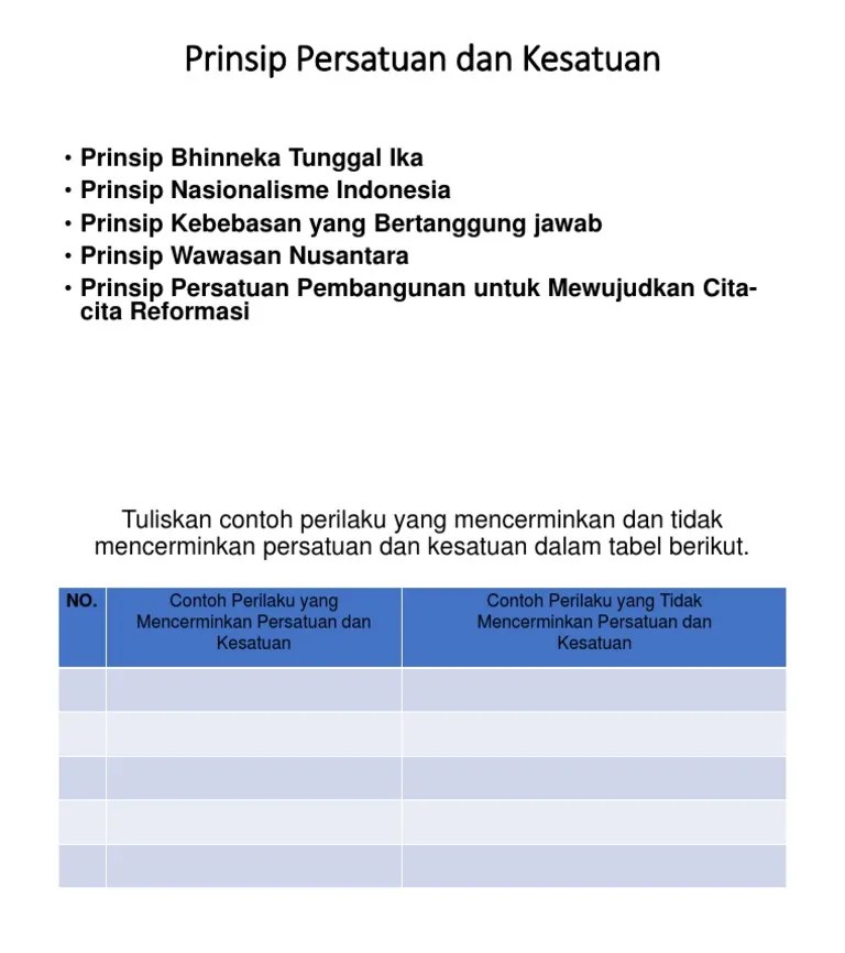 Sebutkan 3 contoh sikap/perilaku yang mencerminkan persatuan dan kesatuan dalam keluarga! Siswa mendiskusikan dan menuliskan contoh penerapan kegiatan yang sesuai. Berikut ini contoh yang mencerminkan persatuan dan kesatuan di . Perilaku yang mencerminkan persatuan dan kesatuan dalam keluarga, sekolah,. Apa manfaatnya bagi kehidupan keluarga?